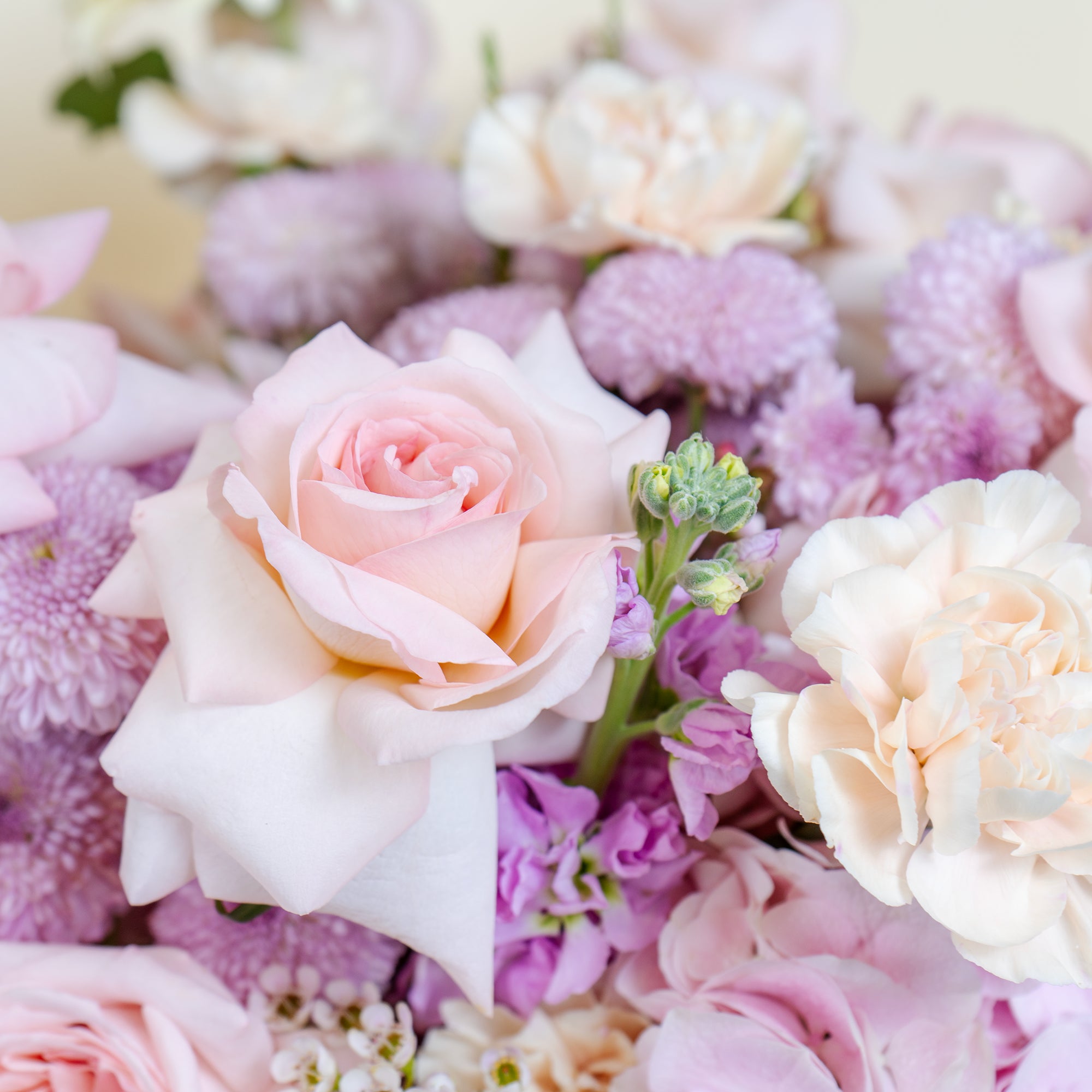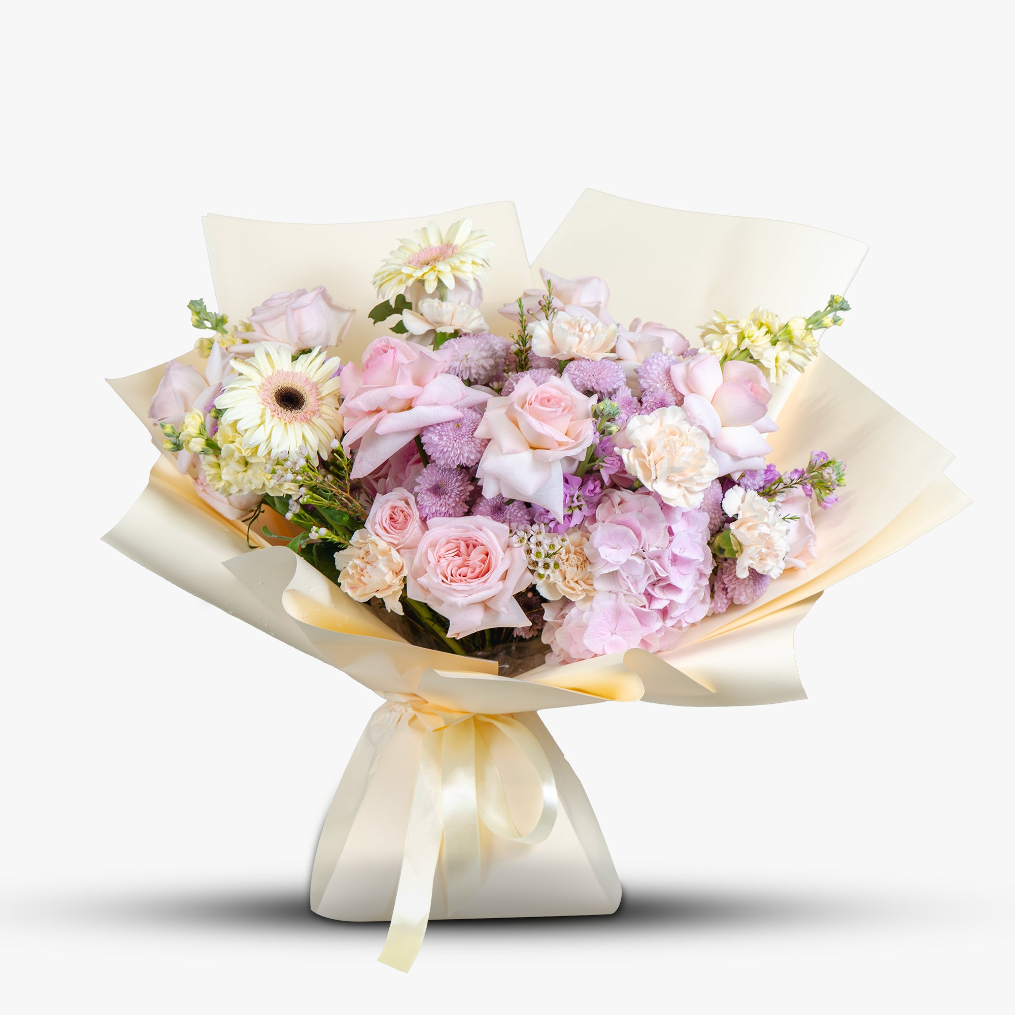 باقة فلورين مزيجٌ رائع من أزهار الباستيل الوردي والكريمي. تضمّ الورود، والجربيرا، والقرنفل، والماتيولا، والأقحوان سانتيني، كل زهرة تُضفي نعومةً وسحرًا. تُغلّف هذه الباقة بورق أبيض ناصع، فتُضفي عليها شعورًا بالانتعاش والبهجة، مثالية لأعياد الميلاد، وبطاقات الشكر، أو ببساطة لإضفاء البهجة على يوم أحدهم.