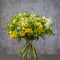 بألوانها النابضة بالحياة التي تُذكّر بمرجٍ مُشمس، تُجسّد جوهر أشعة الشمس والدفء. تتميز الباقة بمزيجٍ رائع من الأزهار الصفراء، بما في ذلك الورود الأنيقة، والأقحوانات المبهجة، والأقحوانات الرقيقة. تُشكّل أوراق الشجر الخضراء الرقيقة خلفيةً تُعزّز الجاذبية البصرية الشاملة.