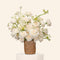 A refined garden-style arrangement of luxurious ivory roses, delicate sweet peas, astrantia, and airy Queen Anne’s lace, arranged with soft movement in a woven natural vase. The composition evokes a calm meadow-like elegance, balancing structure with effortless botanical flow.
