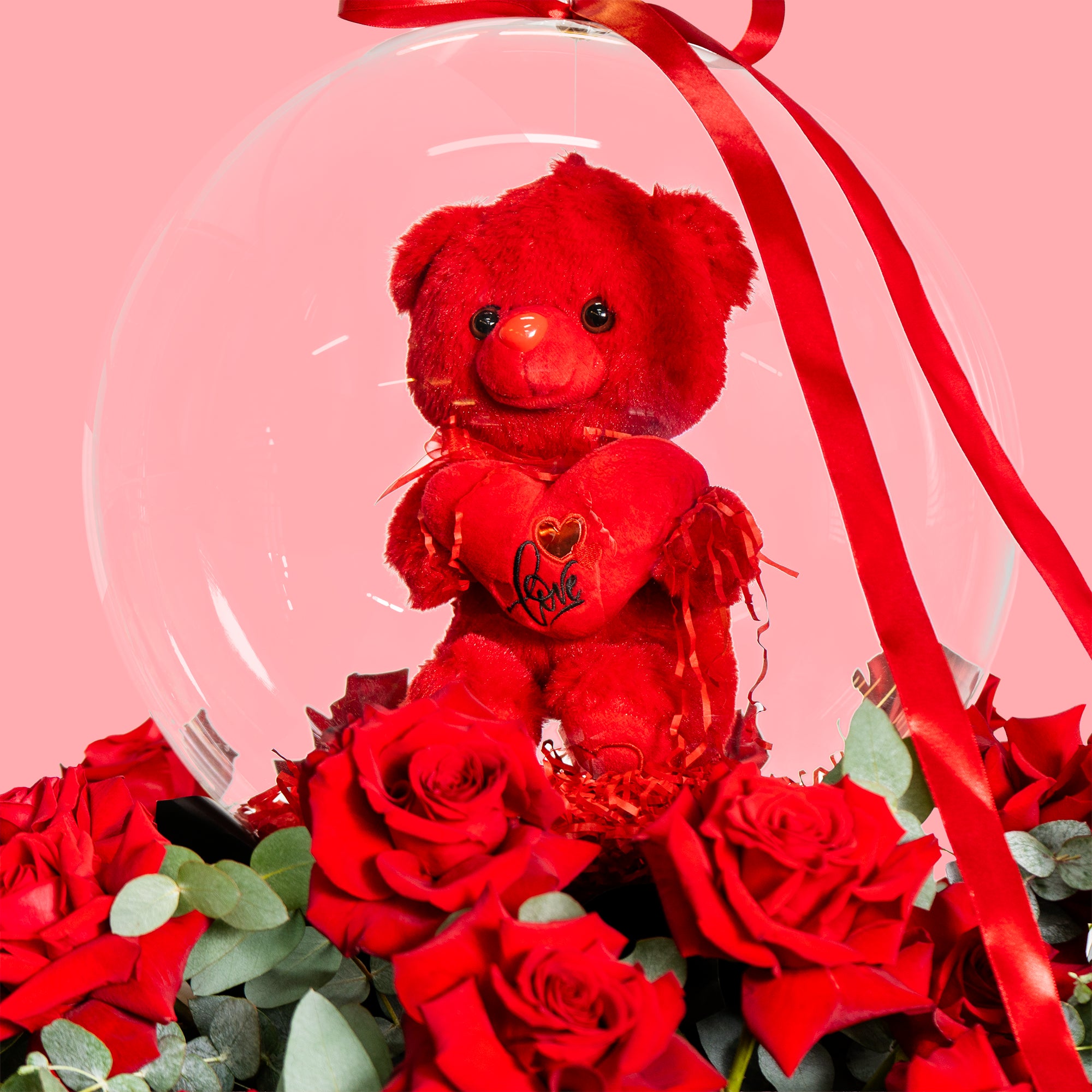 Crimson Bear Rose Dome is a bold expression of love and devotion, designed to leave a lasting impression. This luxurious arrangement features premium fresh red roses, carefully hand-arranged with soft eucalyptus accents to create depth, texture, and elegance.