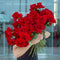 وردة حمراء نقية زاهية، ذات رأس كبير وبتلات متدحرجة بلطف تنفجر في زهرة كبيرة جميلة.