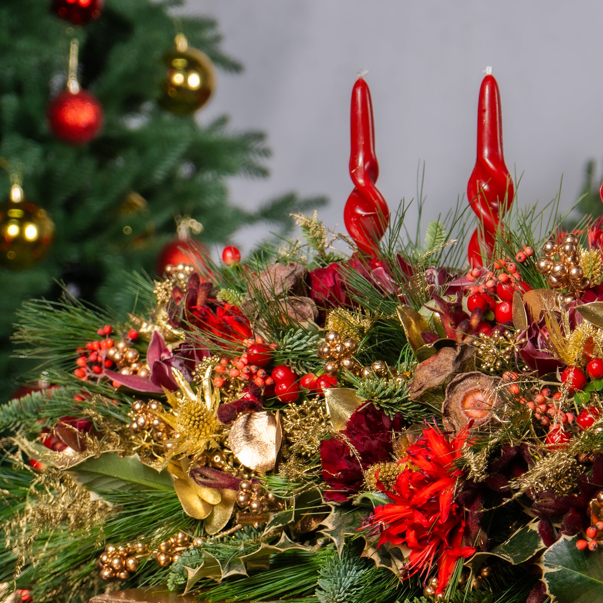 A grand Christmas centerpiece designed for clients who expect high-impact festive styling. Royal Ember fuses rich winter greens with deep red florals, gold botanical accents, berries, and sculptural twisted candles for a dramatic, elongated silhouette. This piece is engineered for statement dining tables, receptions, and luxury holiday settings — bold, opulent, and unmistakably premium.