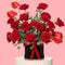A bold floral statement crafted for maximum visual impact. The Large size showcases an abundant display of premium red roses, enhanced by striking anthuriums and layered eucalyptus foliage. The arrangement is expansive and dynamic, creating depth, movement, and a commanding presence within its black velvet box.